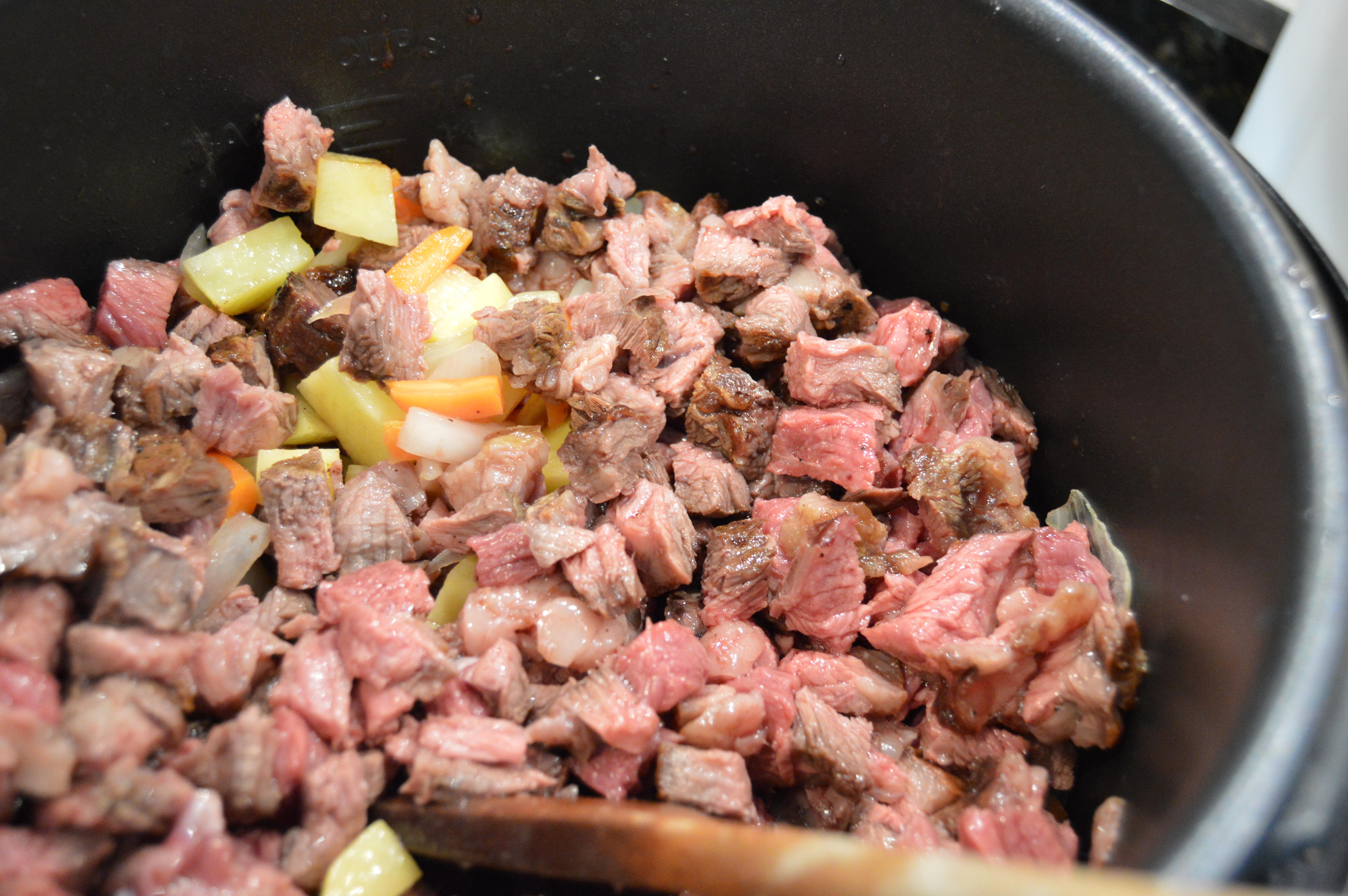 Deixe fritar por uns 2 minutos. Acrescente a carne e frite por mais 2 minutos.