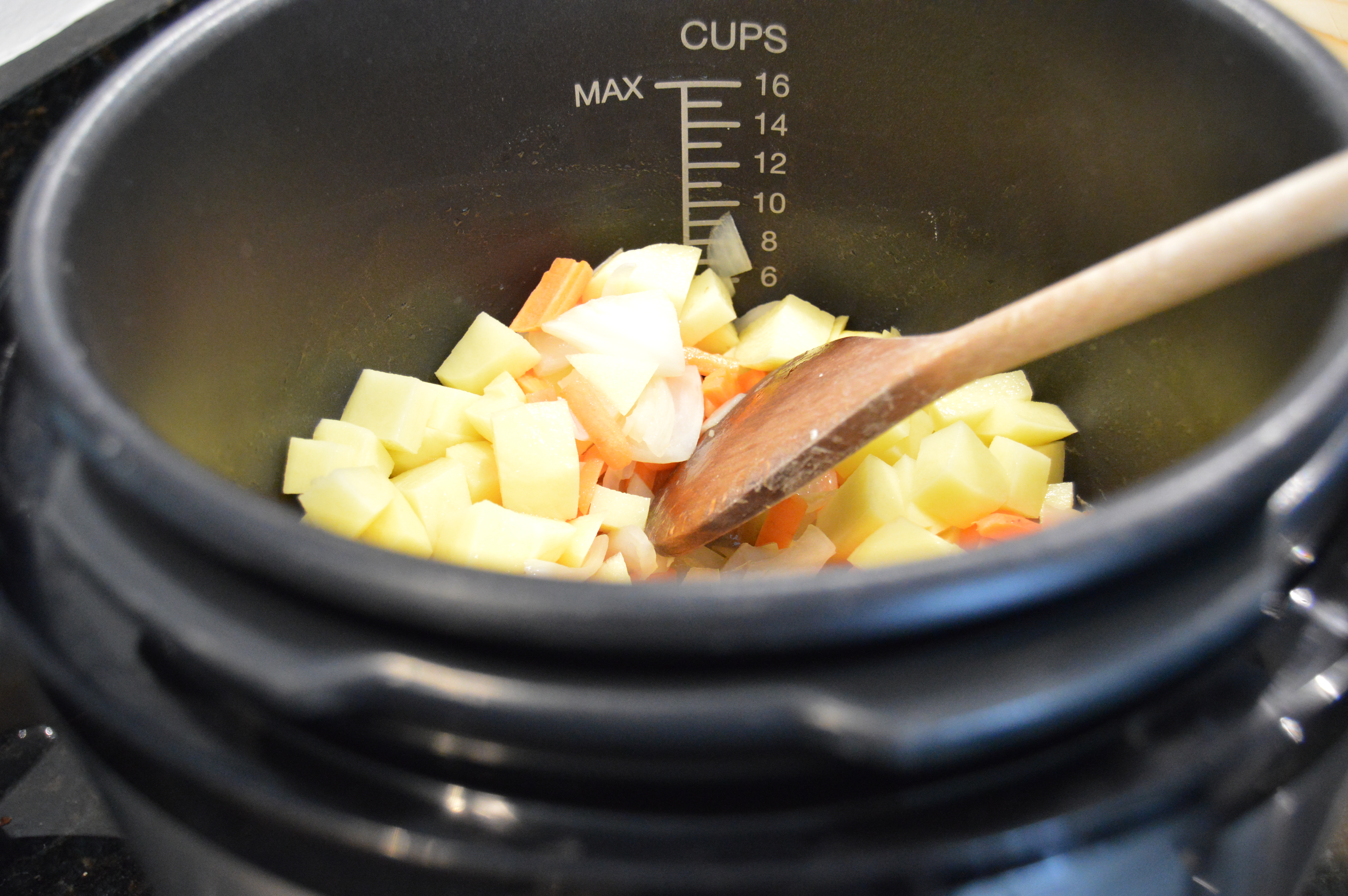 Frite a cebola no óleo até dourar. Acrescente a cenoura e a batata.