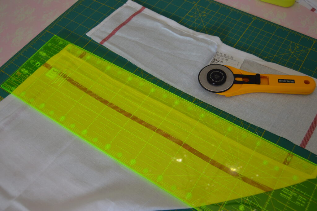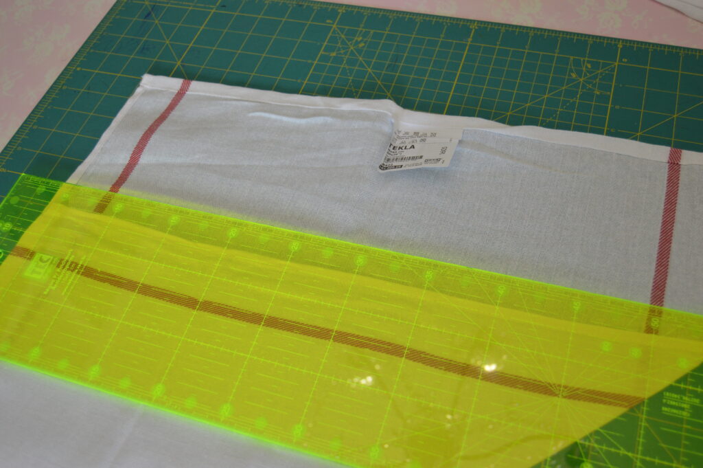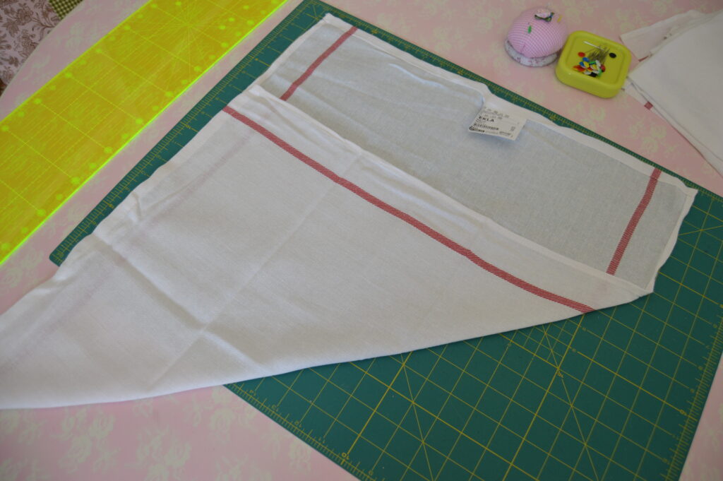 Primeiramente, dobrando assim, dessa forma, o quadrado final fica perfeito, já que o pano de prato é retangular. Deixei 2cm a mais para fazer a nova bainha.