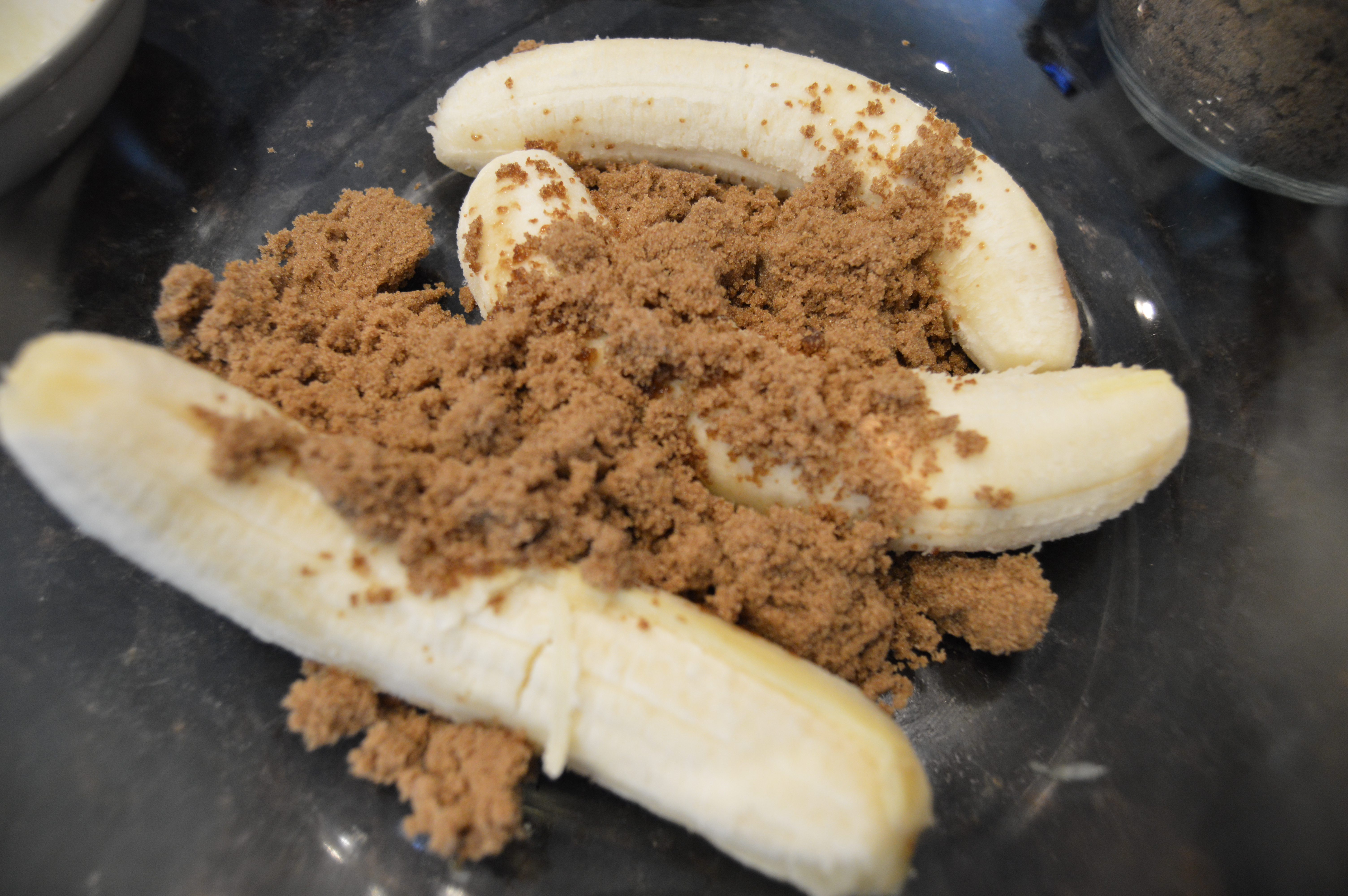 Amasse as bananas com o açúcar.