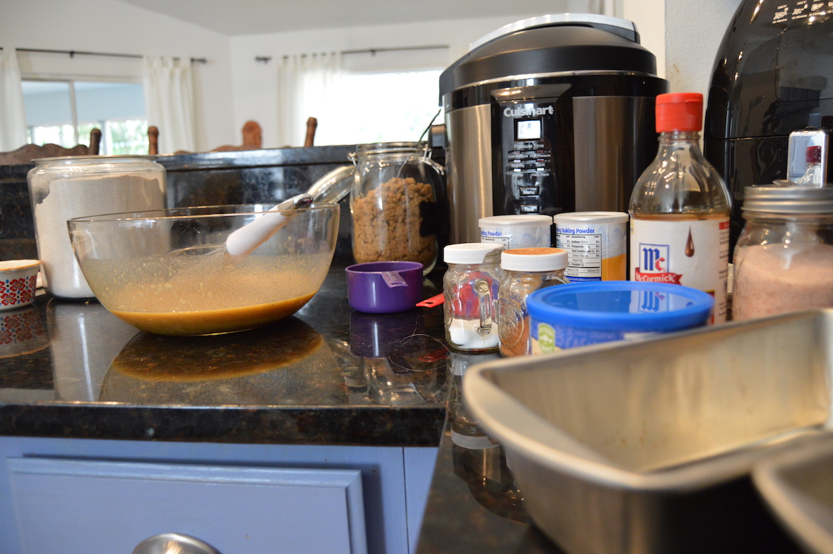Acrescente a farinha, a manteiga derretida, o bicarbonato, o fermento e o sal, misturando sem bater. Polvilhe o quanto gostar de canela em pó. (eu amo!)