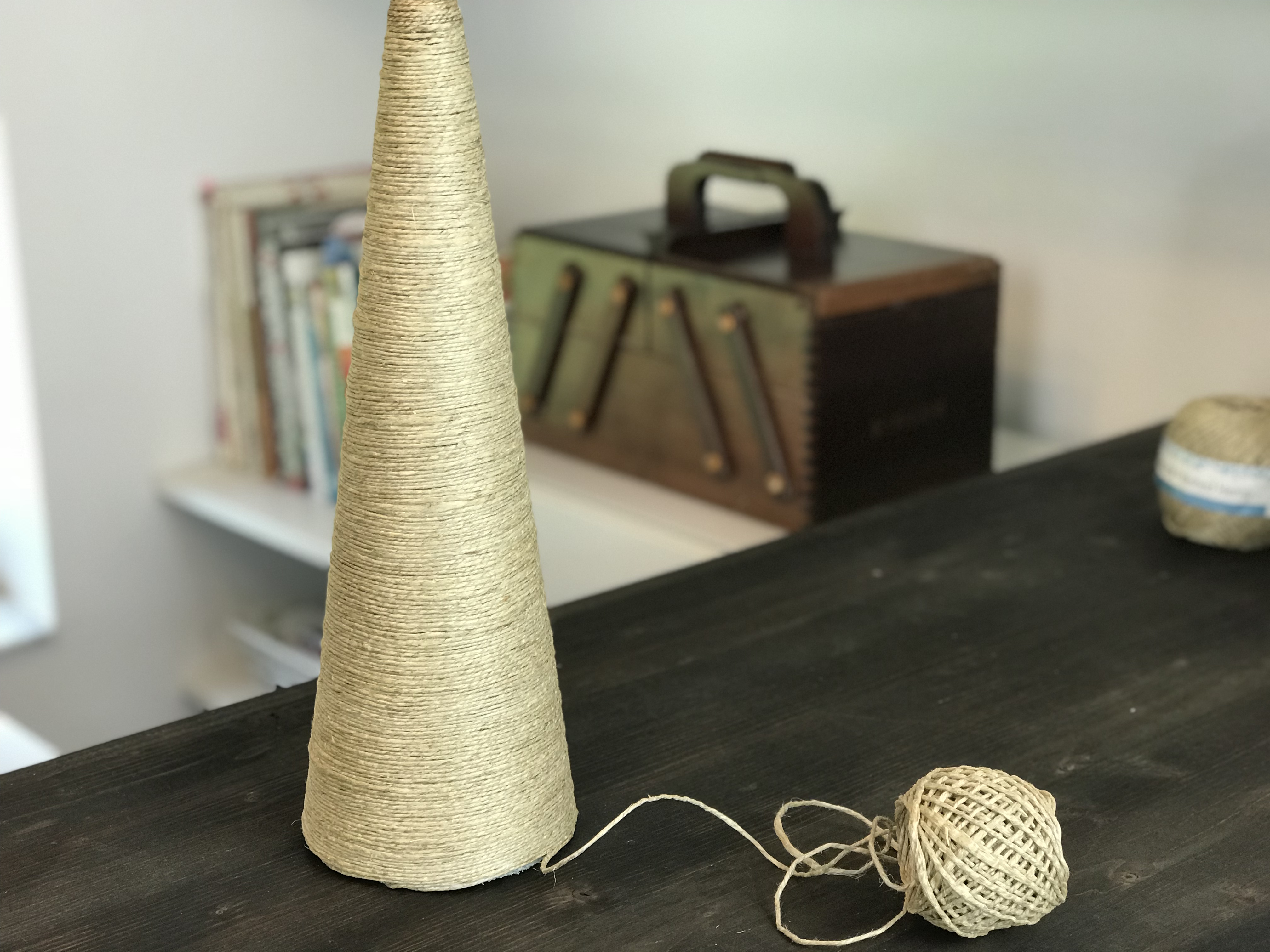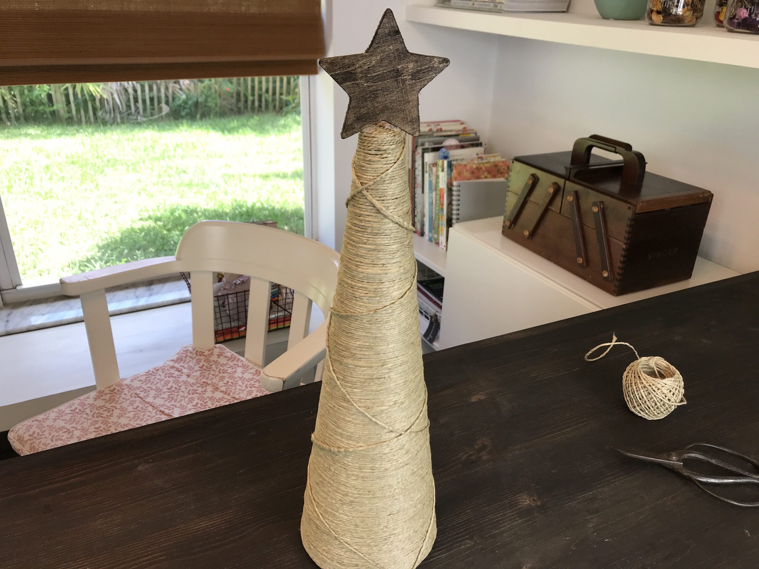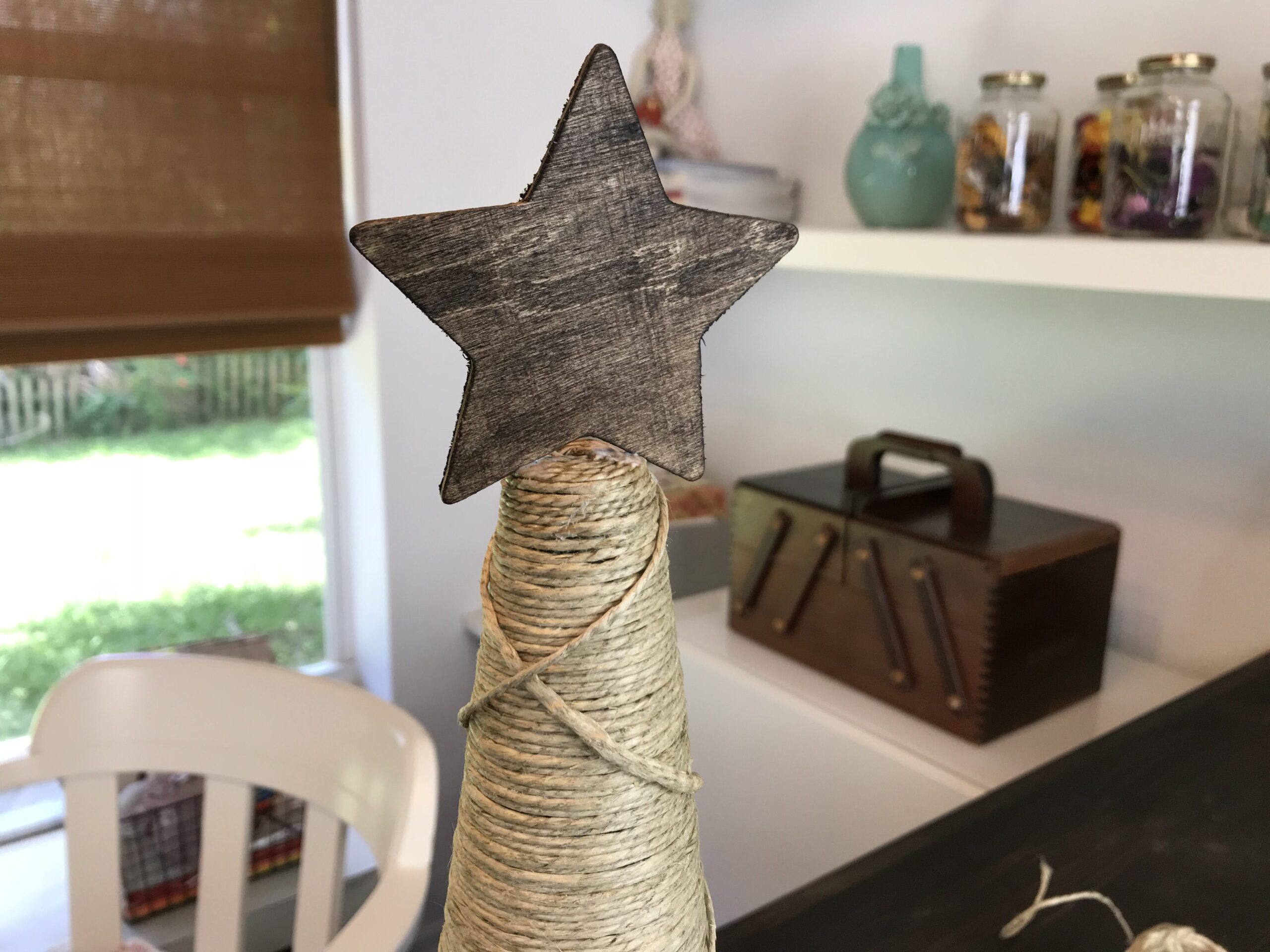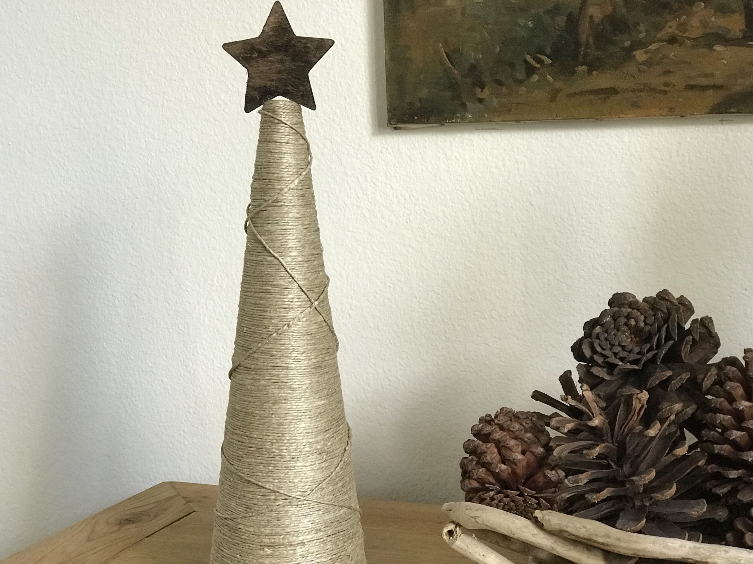 Pra esse projeto, você vai precisar de um cone de isopor ou qualquer outro material, cola branca, estrela em madeira ou papelão pintada na cor desejada, um círculo de papel (usei o papel pardo) para acabamento da base e fio de cânhamo ou juta.