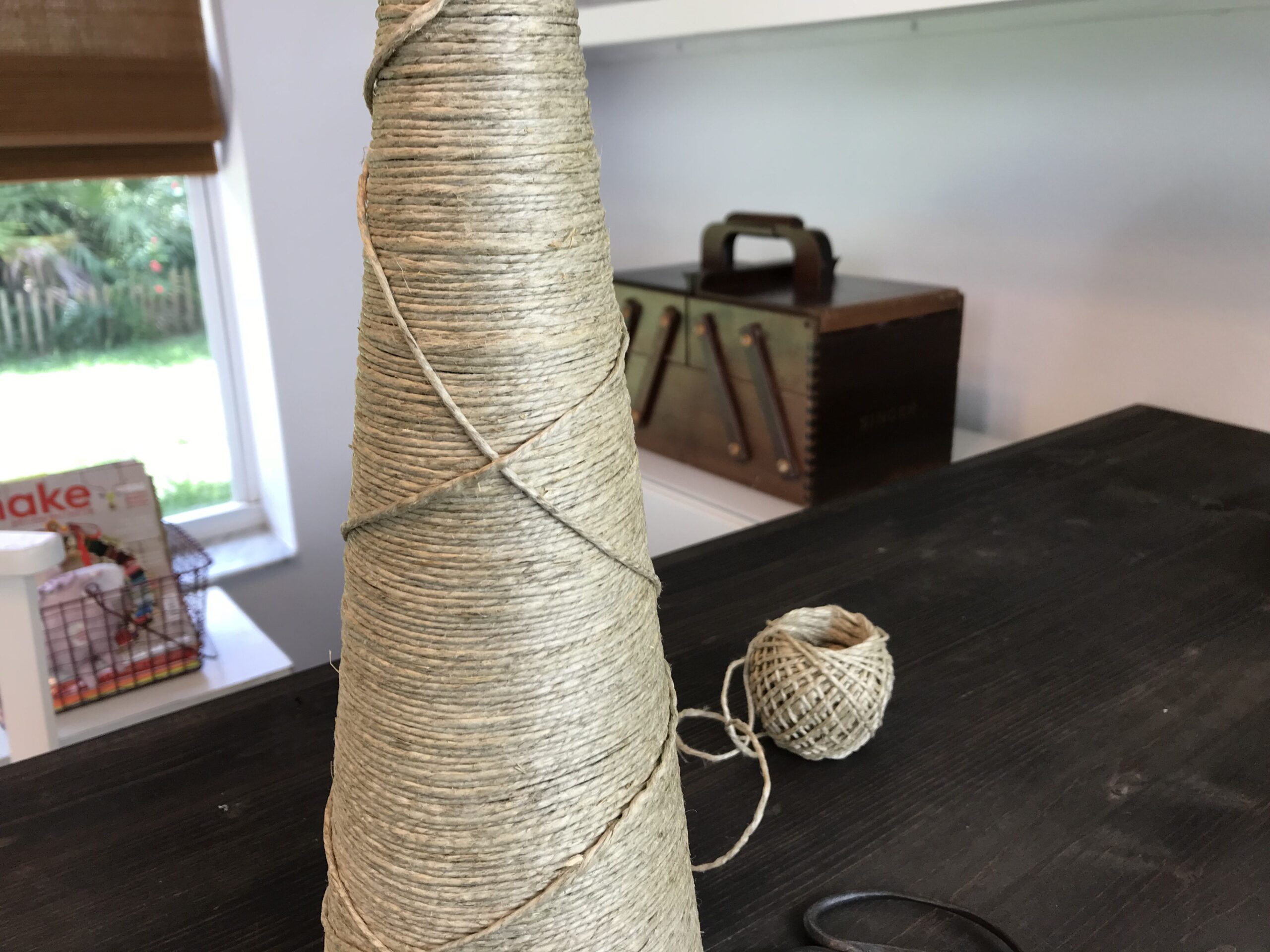 Suba passando por baixo da base do cone e desça cruzando para acrescentar esse detalhe lindo! Termine com o fio novamente embaixo da base. Corte e passe bastante cola.