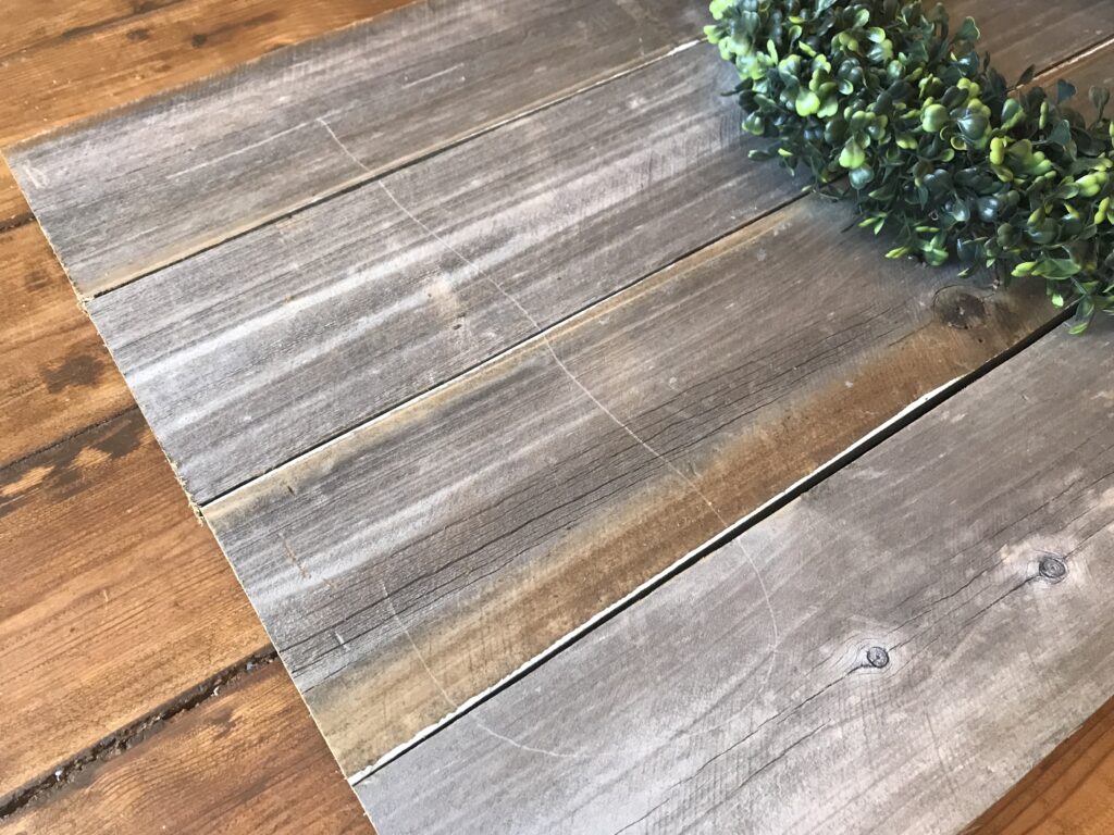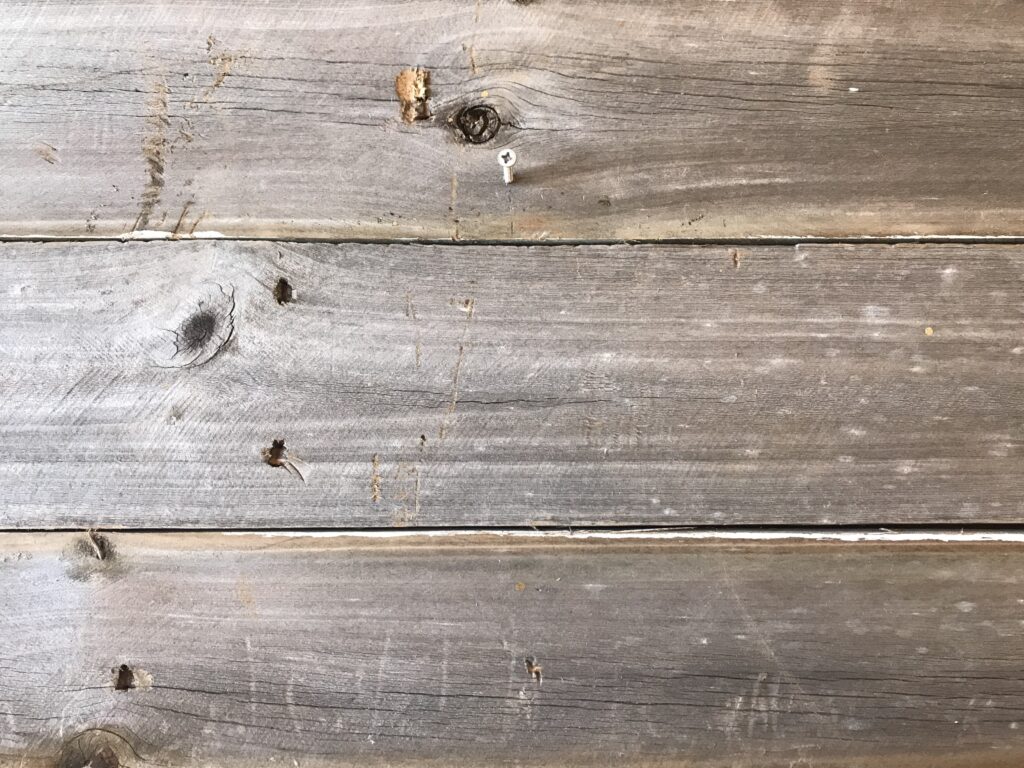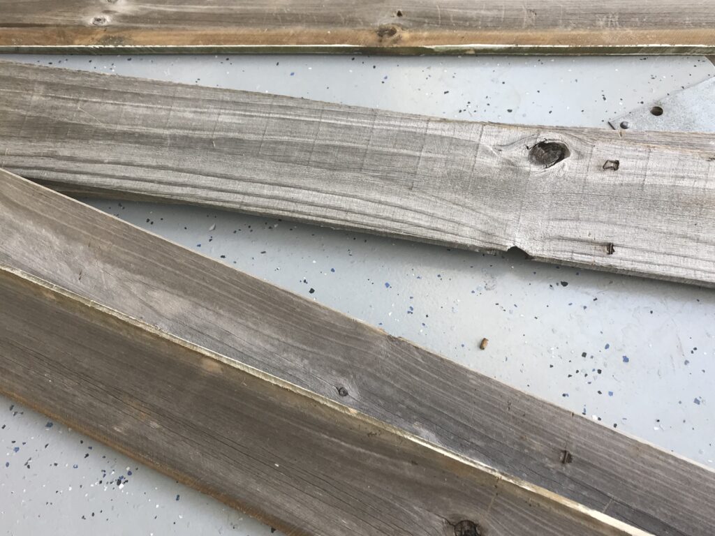 Separe pedaços de madeira que você mesmo pode cortar ou, peça para já cortar no tamanho desejado na madeira ou loja de materiais de construção que você comprar. O tamanho vai depender do tamanho da guirlanda que você vai usar. No meu caso, eu usei madeiras que, no final, totalizaram 1,00 x 0,50cm. Essas madeiras eram de uma antiga cerca que o Fabio encontrou na rua, por isso já estão com esse aspecto envelhecido, mas, no caso de usar madeiras novas, você pode envernizar com verniz fosco para dar essa mesma aparência. Ou, também, pintar da cor que desejar.
