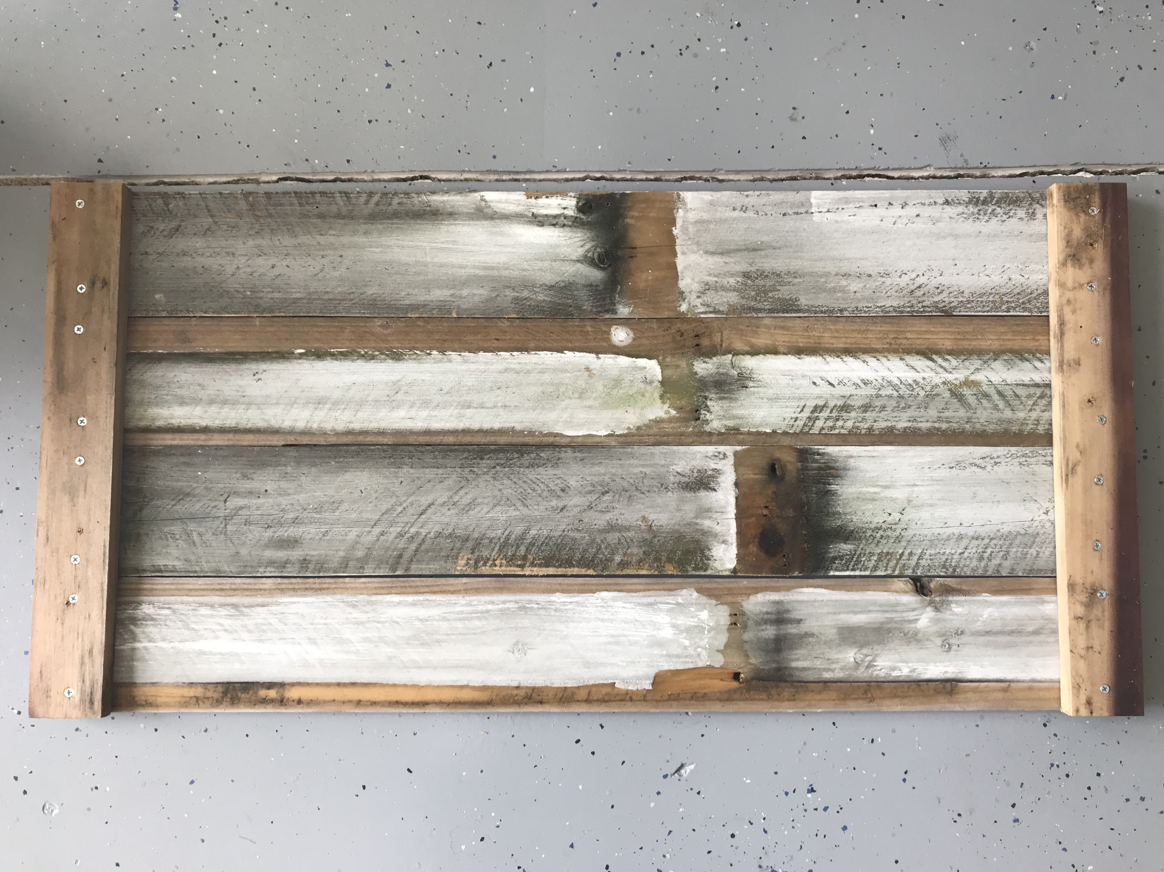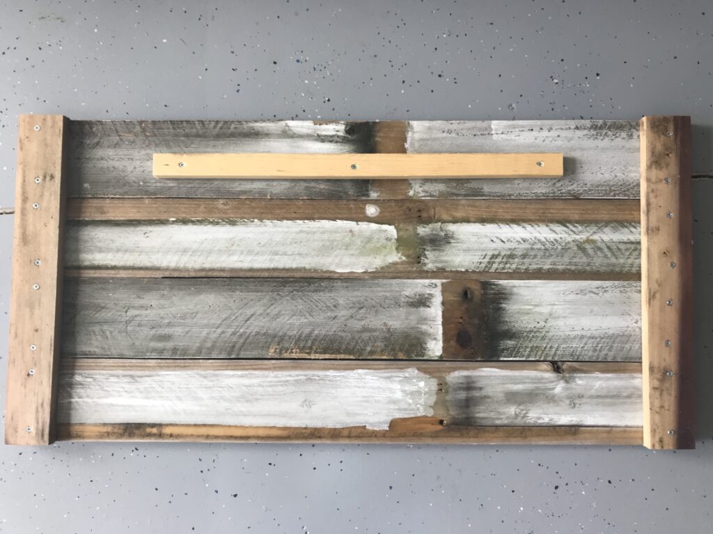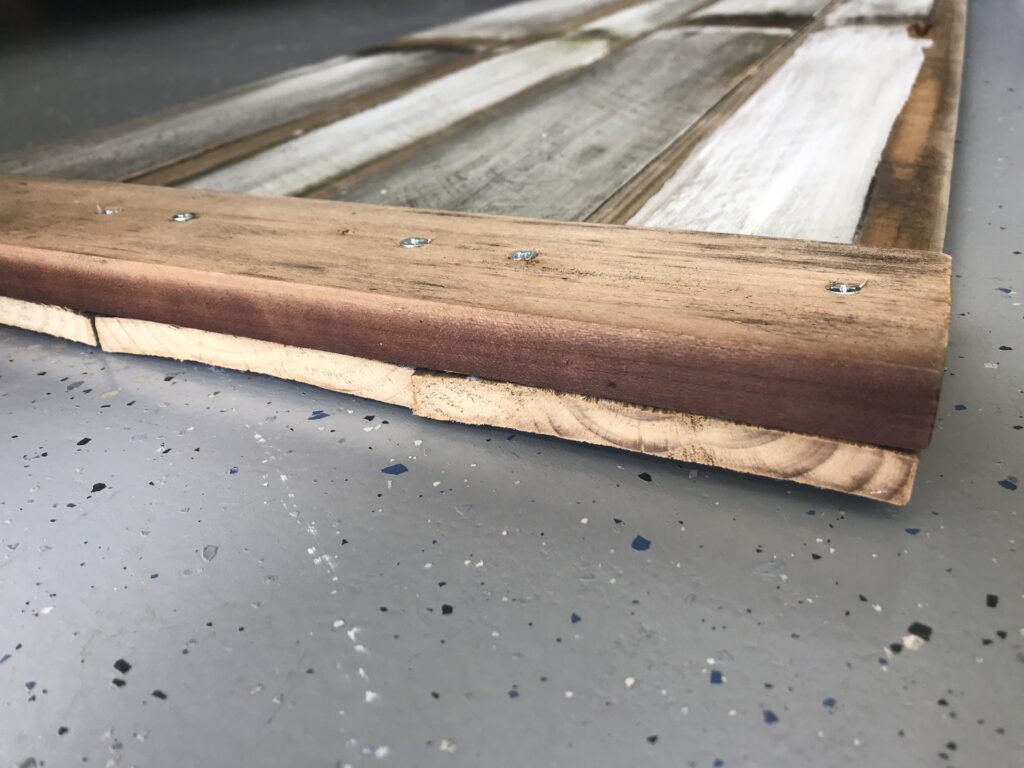 Se você for pendurar na parede, coloque mais um pedaço dessa ripa atrás, para você apoiar em dois ou mais parafusos na parede, devido ao peso da placa e, também, para ficar bem alinhada. Observe que, dessa vez, não coloquei rente à lateral.