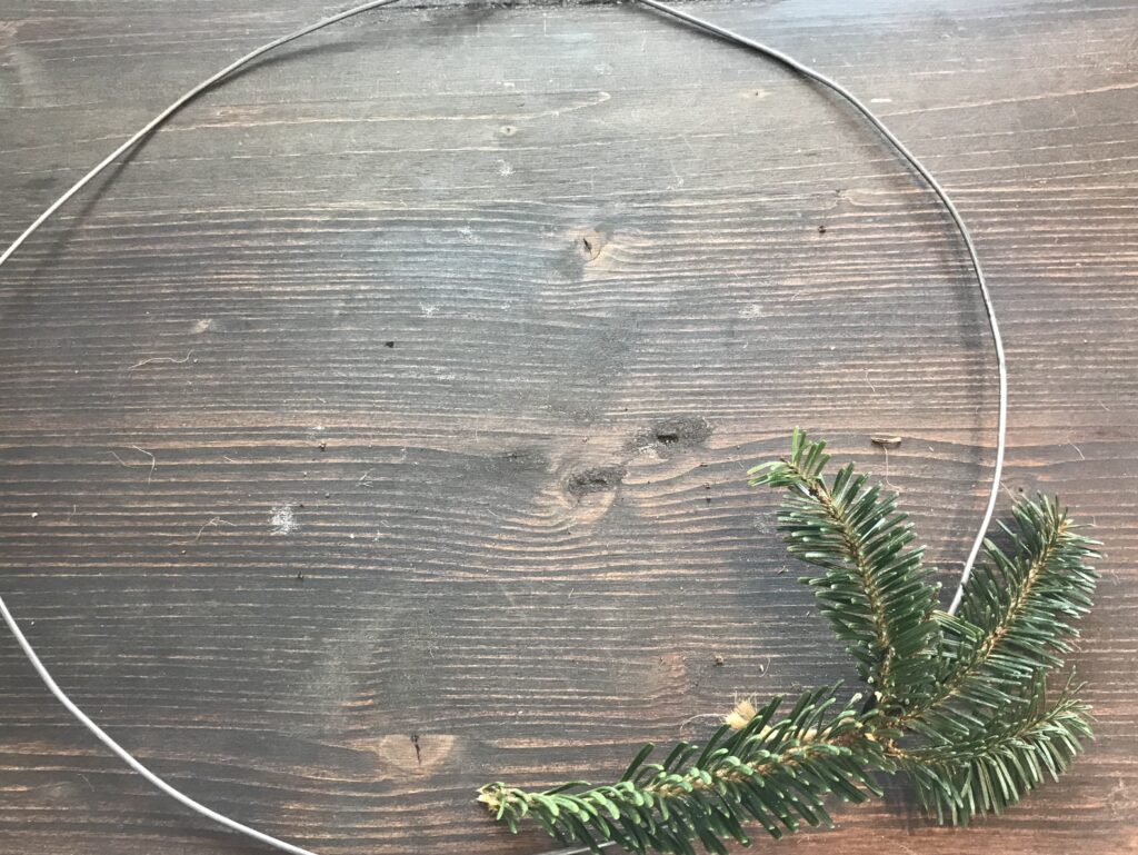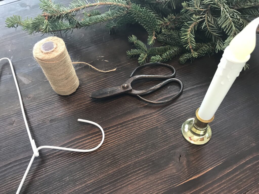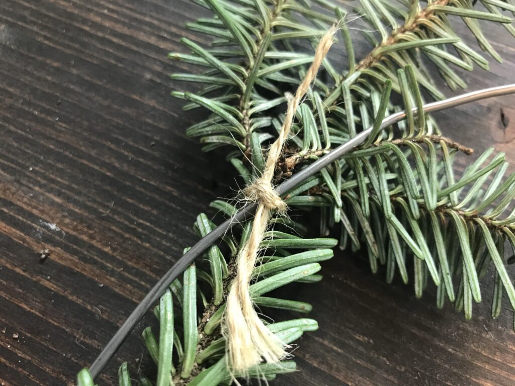 Com um pedaço pequeno de fio de juta, amarrei os raminhos do pinheiro.