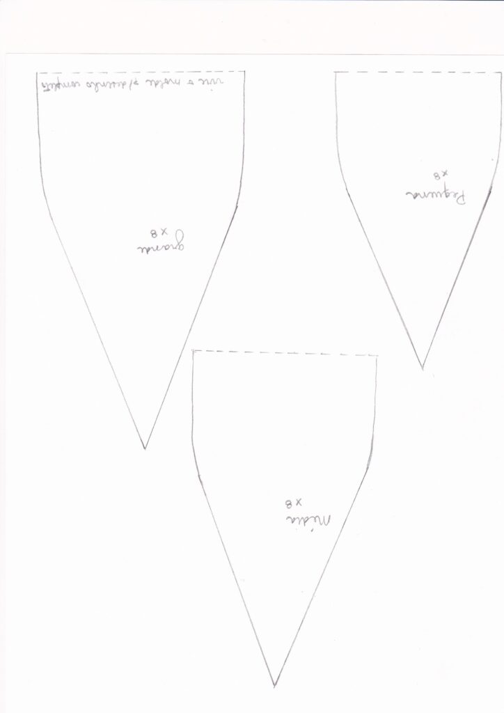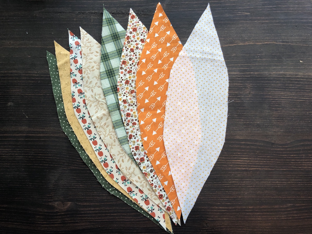 Comece selecionando seus 8 tecidinhos. Eu escolhi ficar nas cores das abóboras e do outono, mas, mesmo com cores mais alegres, no caso, da Primavera, ficarão lindas!! Risque o molde e corte na linha riscada, pois esse molde já vem com margem de costura. Corte e já pense na ordem de cores que quer deixar.