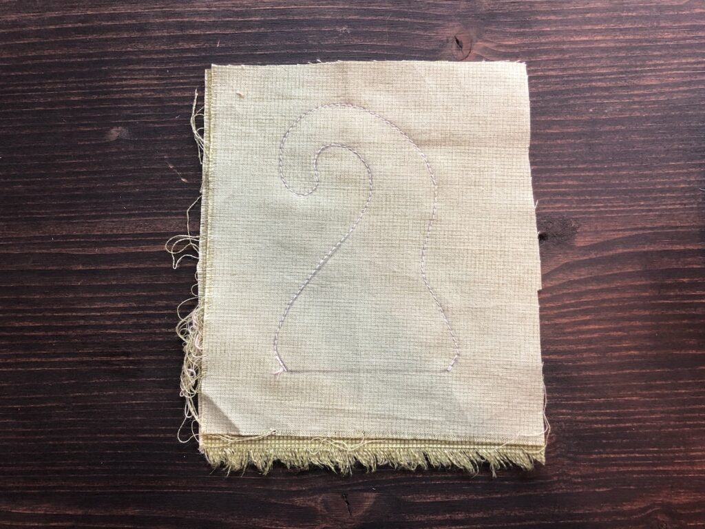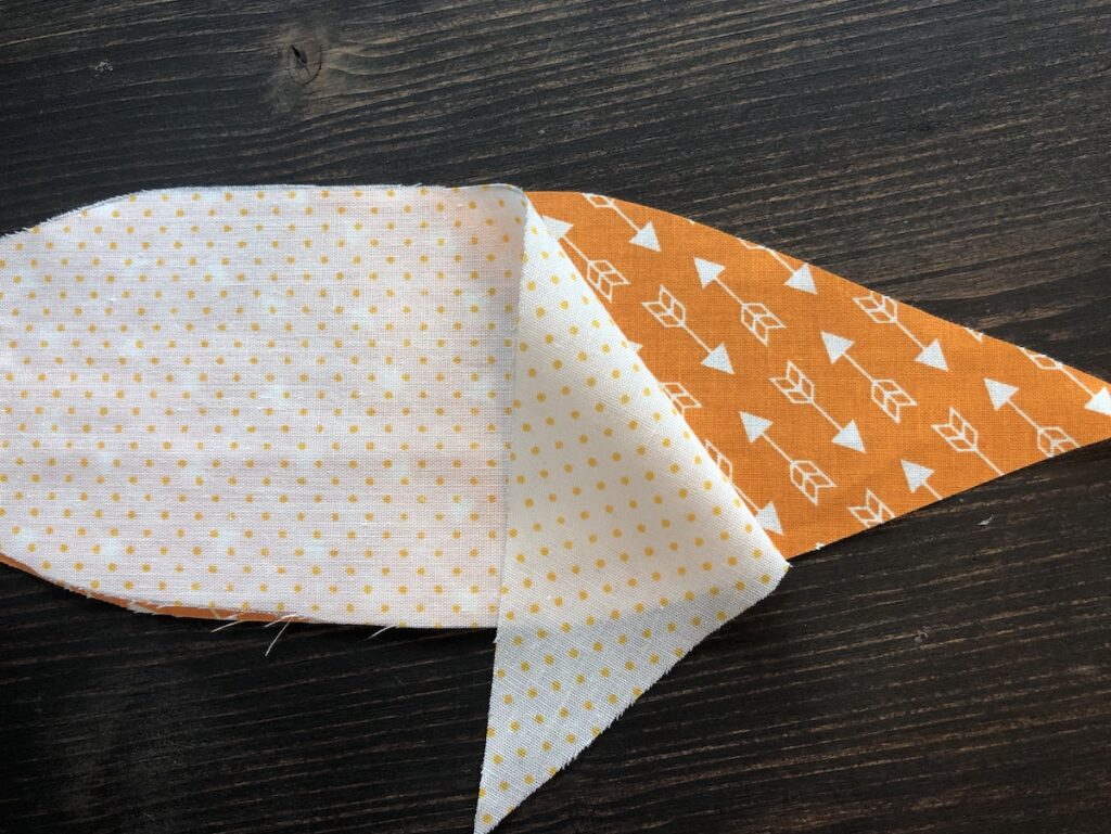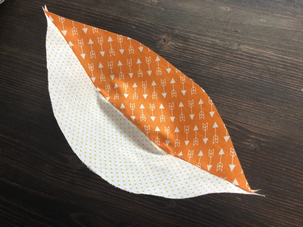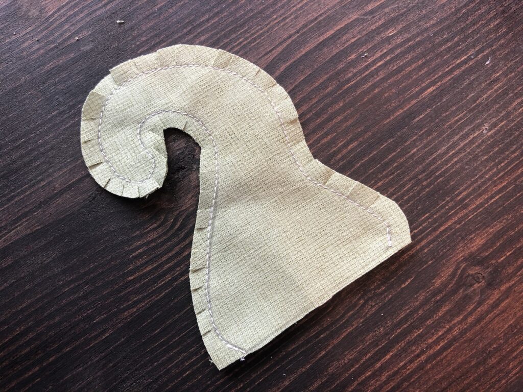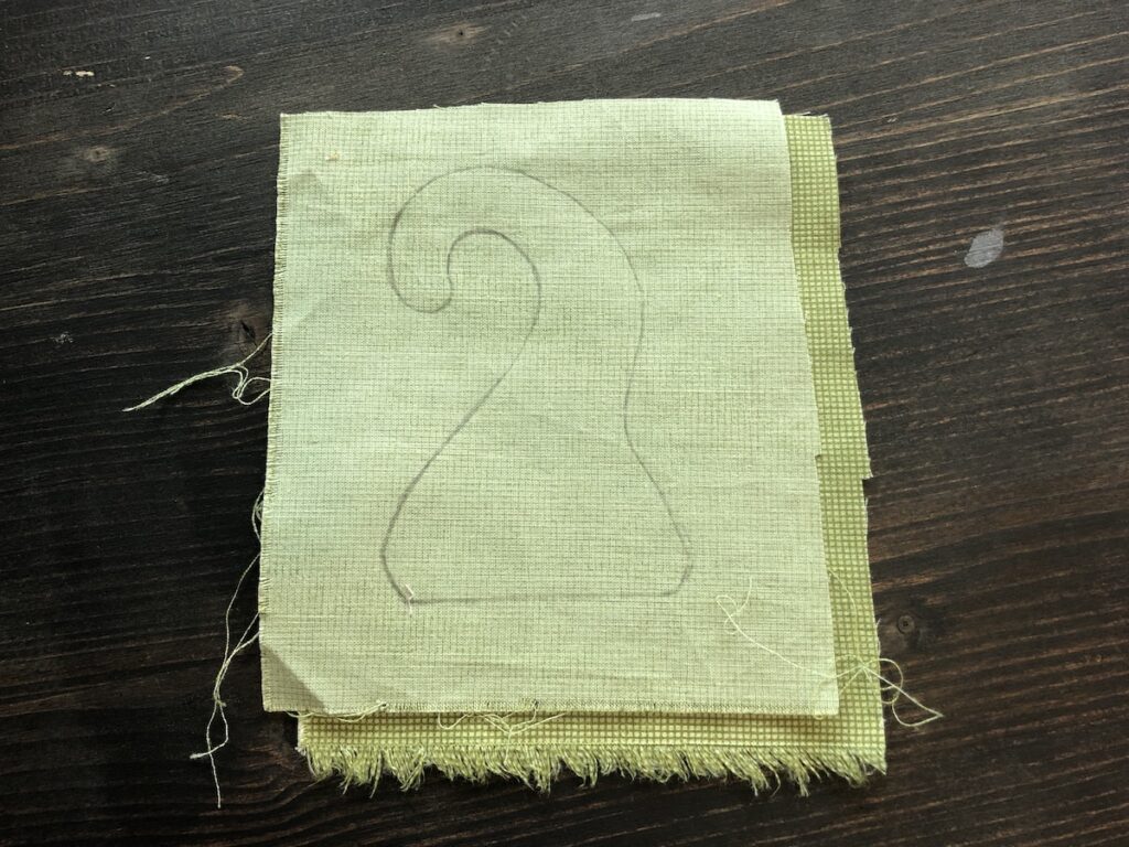 Para o “cabinho” dela, escolha um tecido (esse sim deve manter a cor verde). Ele deve ser duplo. Posicione direito com direito. Desenhe o molde e, diferente da abóbora, costure em cima da linha que você acabou de desenhar.