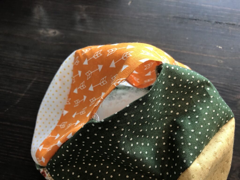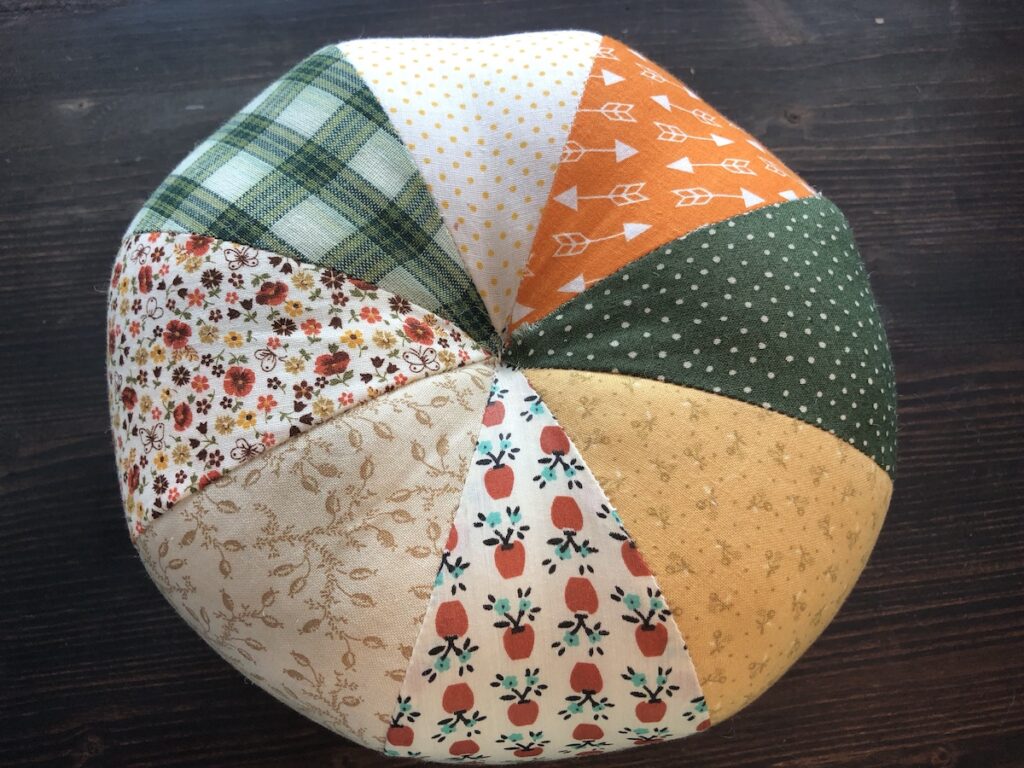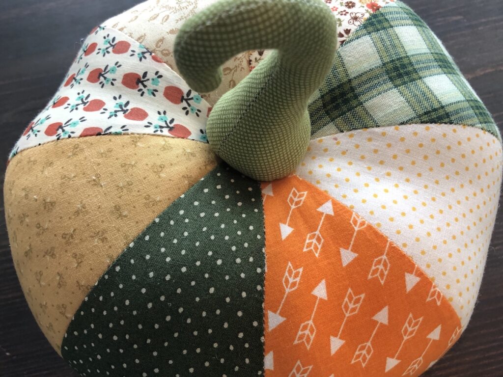 Com uma agulha grande e linha de bordar, passe de um lado para outro, para que fique com o formato mais achatado no centro da abóbora. Arremate bem.