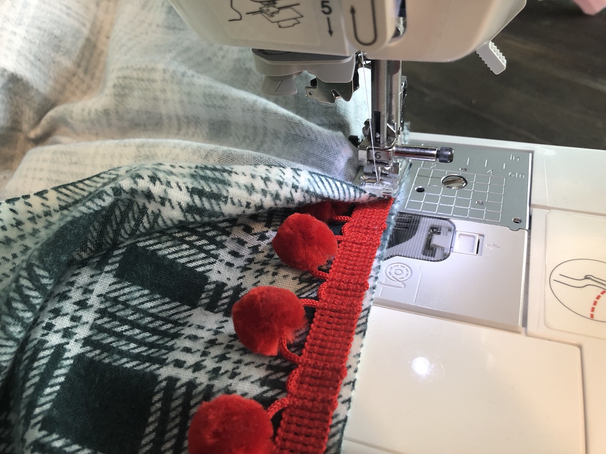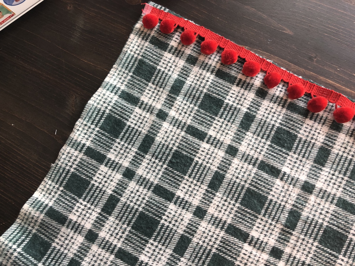 Posicione os pompons no lado direito do tecido e para o lado de dentro de uma das partes da manta.