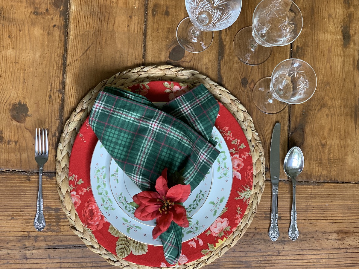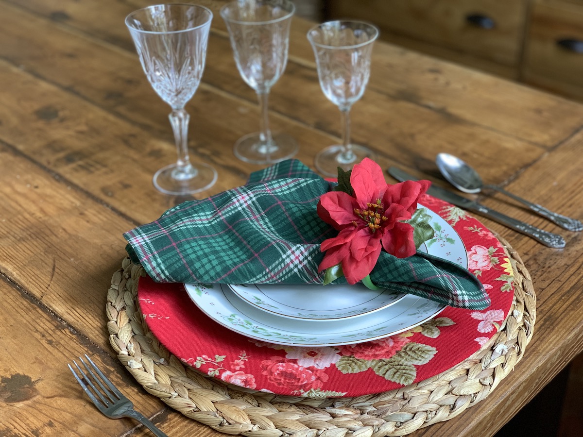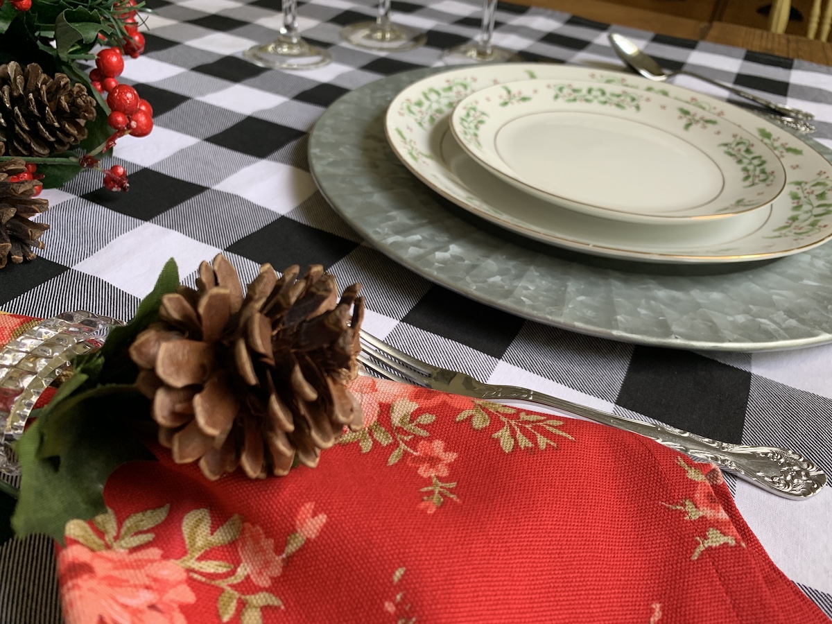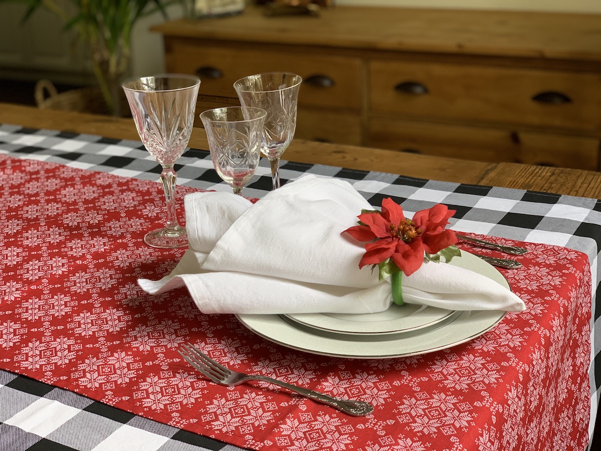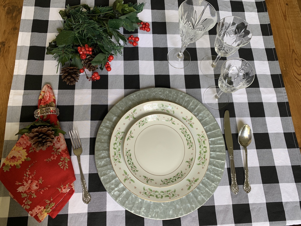 Mais uma composição que amo! Essa capa de sousplat xadrez eu uso muito! Principalmente quando temos massa por aqui. Ela é muito “italiana”, não é mesmo?! Porém, junto com o guardanapo e o porta-guardanapo em tema natalino, tudo se transforma! O caminho de mesa também é bem neutro, trazendo somente a cor do Natal e pode ser usado em outras composições. Detalhe, ele foi comprado numa venda de garagem por $3,00!