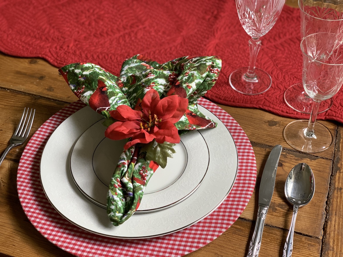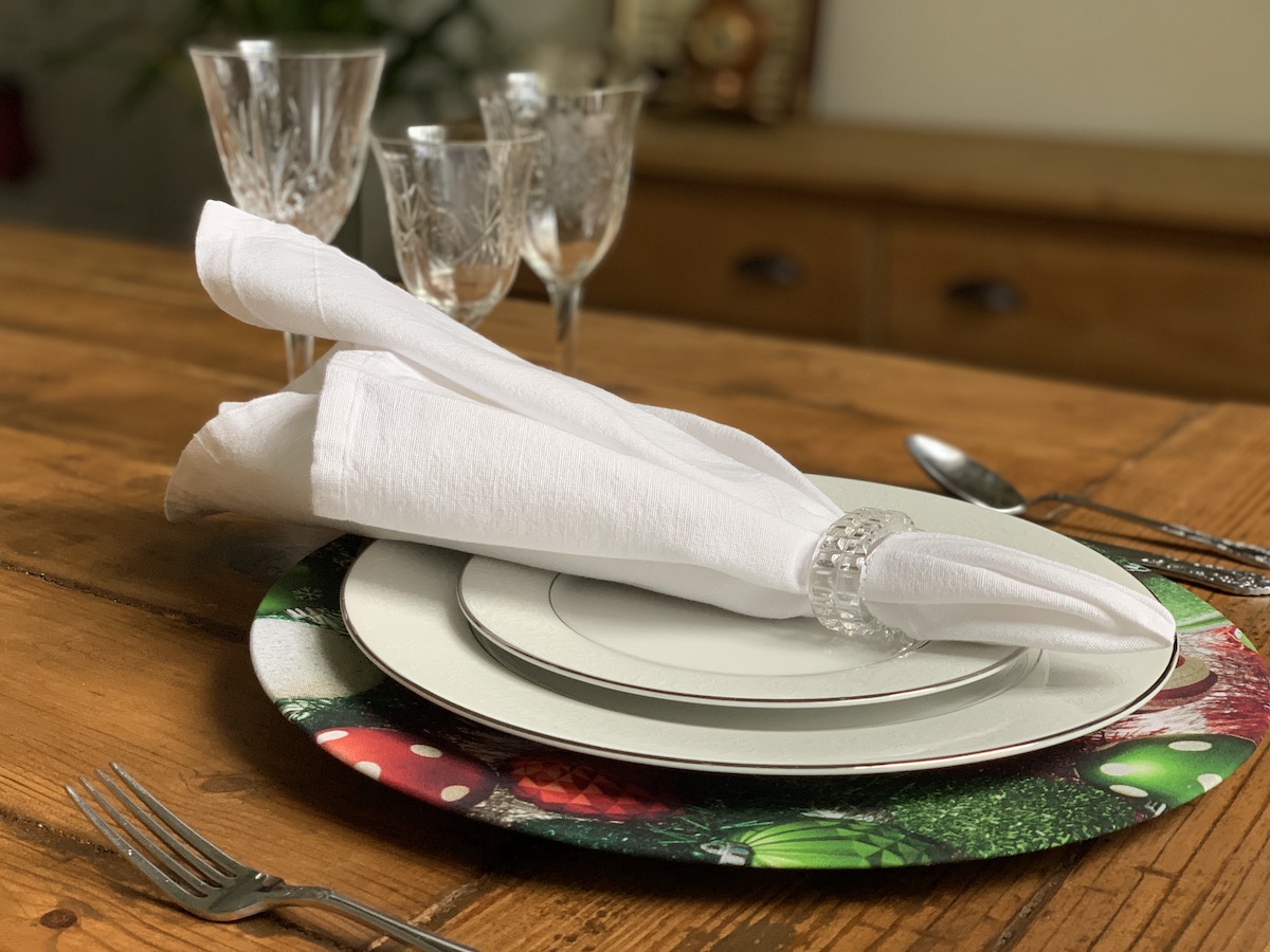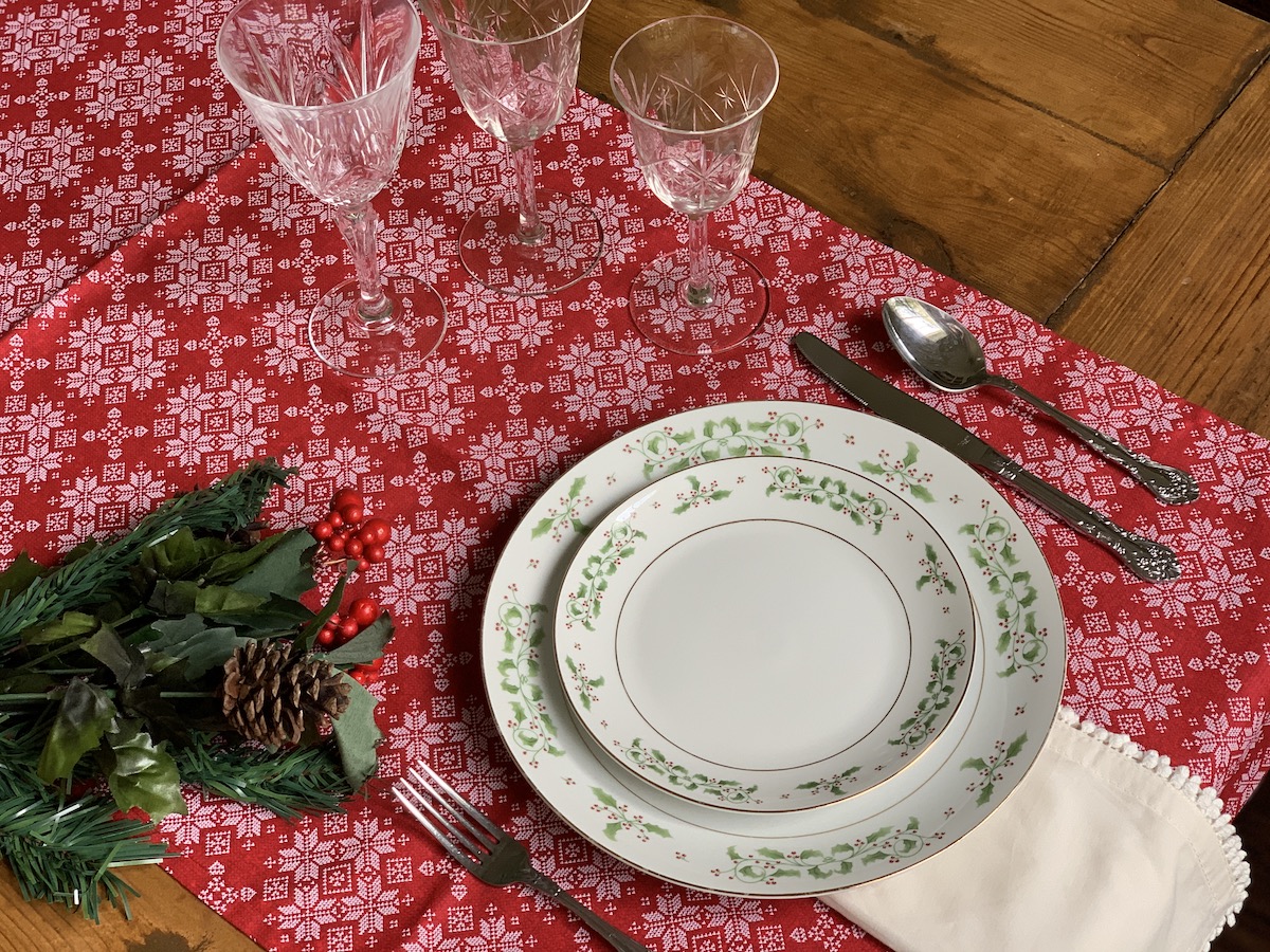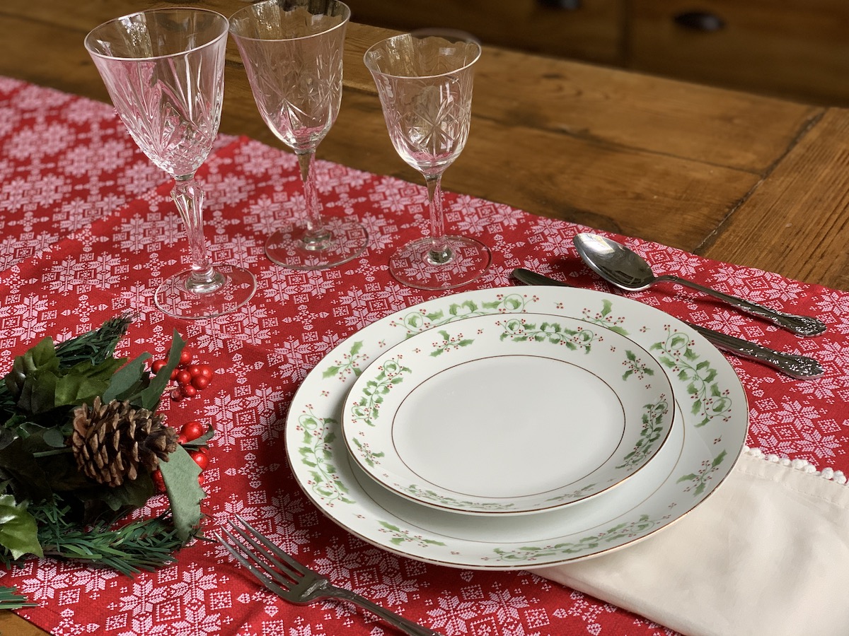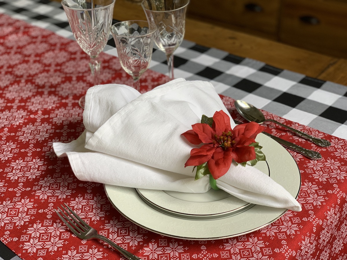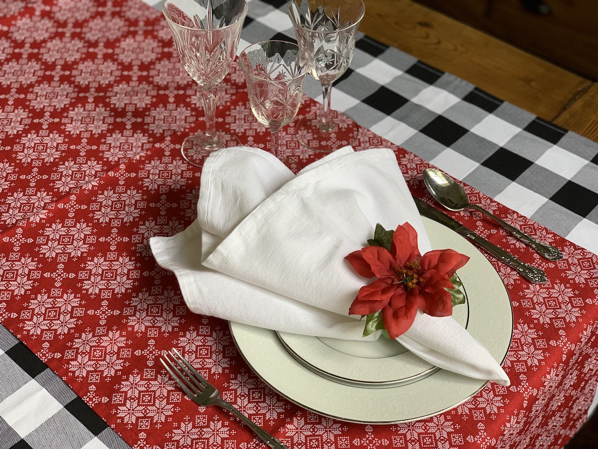 Mais uma composição que amo! Essa capa de sousplat xadrez eu uso muito! Principalmente quando temos massa por aqui. Ela é muito “italiana”, não é mesmo?! Porém, junto com o guardanapo e o porta-guardanapo em tema natalino, tudo se transforma! O caminho de mesa também é bem neutro, trazendo somente a cor do Natal e pode ser usado em outras composições. Detalhe, ele foi comprado numa venda de garagem por $3,00!