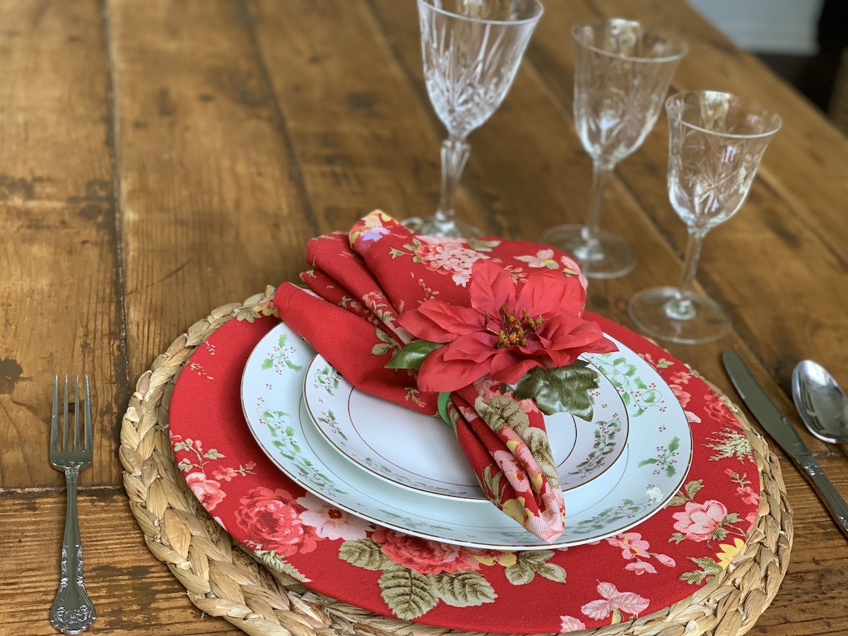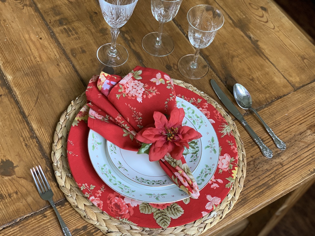 Com o mesmo tecido do sousplat, fiz os guardanapos de tecido e usei juntos aqui. Eu amei! Tirando o porta-guardanapo e mudando os pratos, essa composição pode ser usada o ano todo!