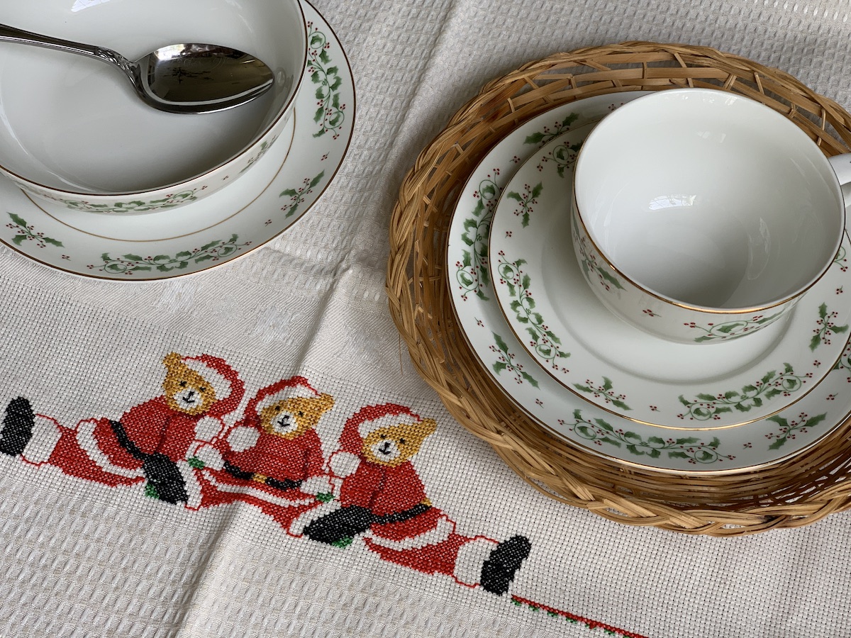 Essa toalha linda de chá, bordada à mão em ponto cruz, foi um presente da minha amiga querida Sylvia, de Portugal. Não precisa nada, pois a toalha é um show à parte! Eu adoro usar essa ” cestinha” de palha como um sousplat para as louças de café.