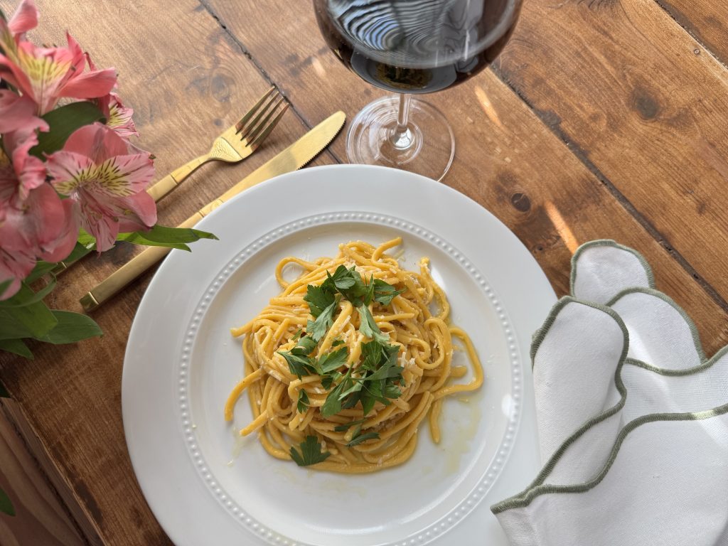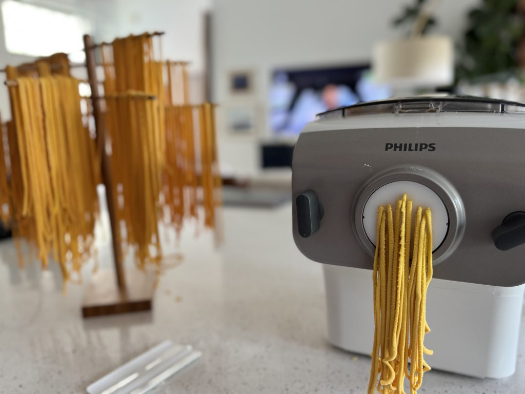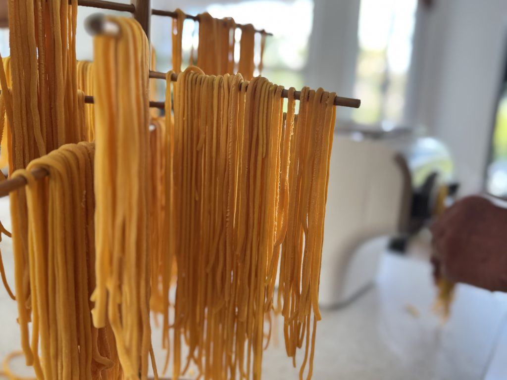 Nós fazemos a massa do macarrão caseira, com uma maquininha que tenho há quase 10 anos e que eu super recomendo!