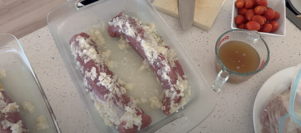 Triturei a cebola com o alho na minha Thermomix, mas você pode usar um processador ou até mesmo o liquidifcador. Depois, em uma tijela, coloque essa misturinha de cebola e alho e o restante dos ingredientes (suco de limão, pimenta do reino, sal, e as folhinhas de louro). Misture bem! E agora é só passar essa marinada sobre os lombos, e deixar esse tempero por, no mínimo, 2 horas marinando. Pode fazer também da noite pro dia que fica ainda mais gostoso!