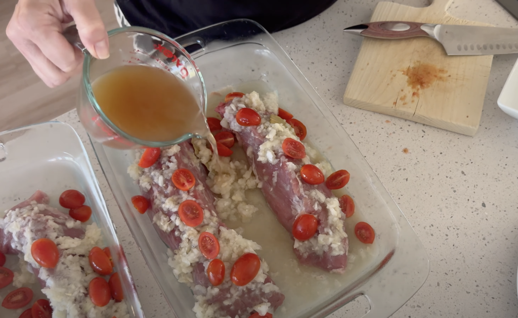 Cubra os lombos com os tomates e regue com o caldo de carne ( dividi 1/2 xícara para cada travessa)