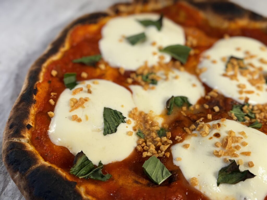 Fizemos uma estilo Marguerita, com molho de tomate, muçarela fresca, manjericão e alho torradinho. Minha favorita!