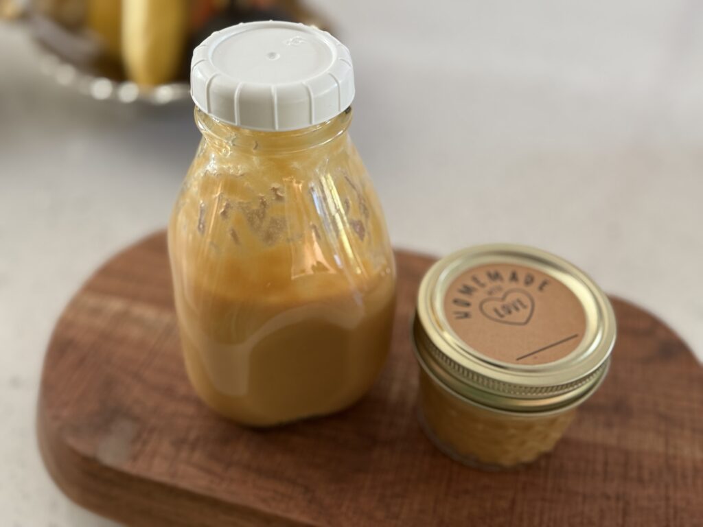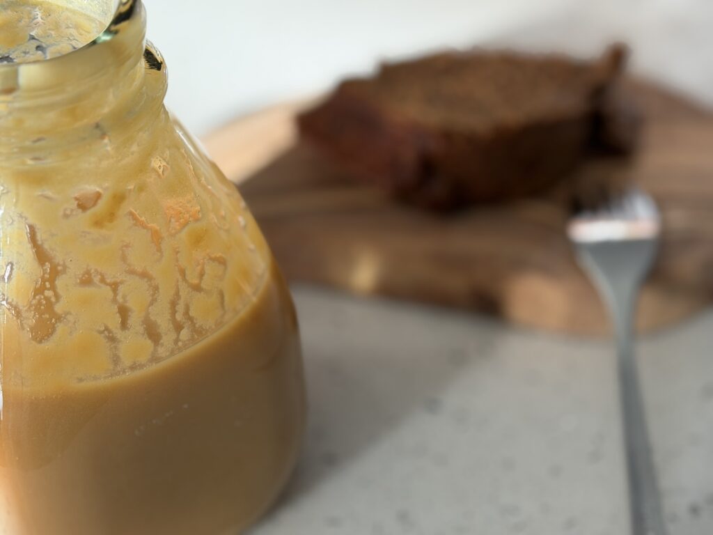 Fiquei pensando em qual bolo fazer, porém, não tinha decidido. Até que, bateu aquela vontade de um docinho para o café da tarde. Pensei em dar uma tostadinha no pãozinho que eu tinha feito de manhã e, me veio doce de leite na cabeça! Resolvi fazer uma caldinha de doce de leite com o doce de leite que eu fiz há um tempinho atrás, dessa receita deliciosa do livro Dona Benta que está AQUI. A coisa boa é que eu fiz no método de conserva, como das geleias que já dividi aqui com vocês também, então tenho uns seis potinhos no meu armário!